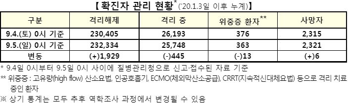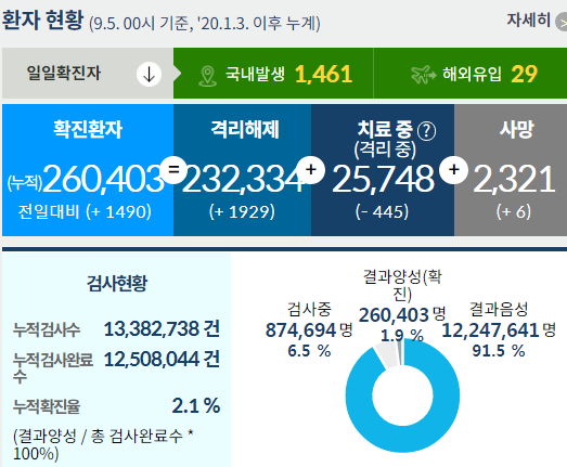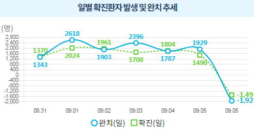 이건 에러난 그림입니다. 구글쪽 그래프도 0명으로 에러입니다. 9월 5일 0시기준 일일신규확진자는 1490명, 일일신규격리해제자는1929명입니다.