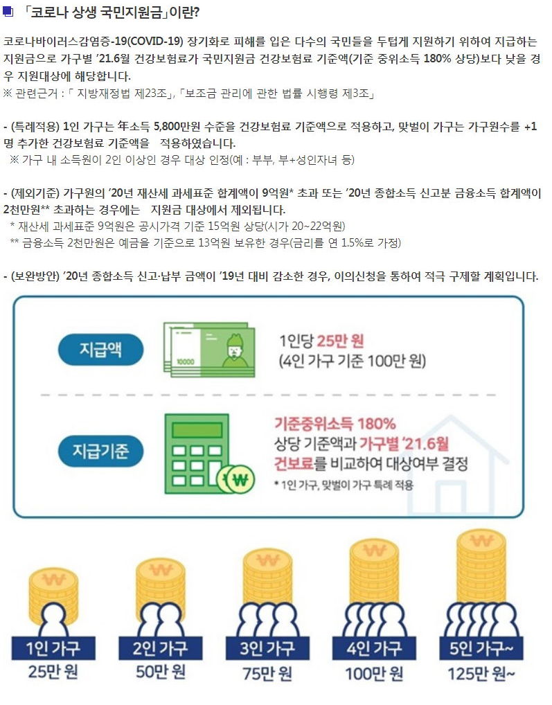 「코로나 상생 국민지원금」이란? 코로나바이러스감염증-19(COVID-19) 장기화로 피해를 입은 다수의 국민들을 두텁게 지원하기 위하여 지급하는 지원금으로 가구별 ’21.6월 건강보험료가 국민지