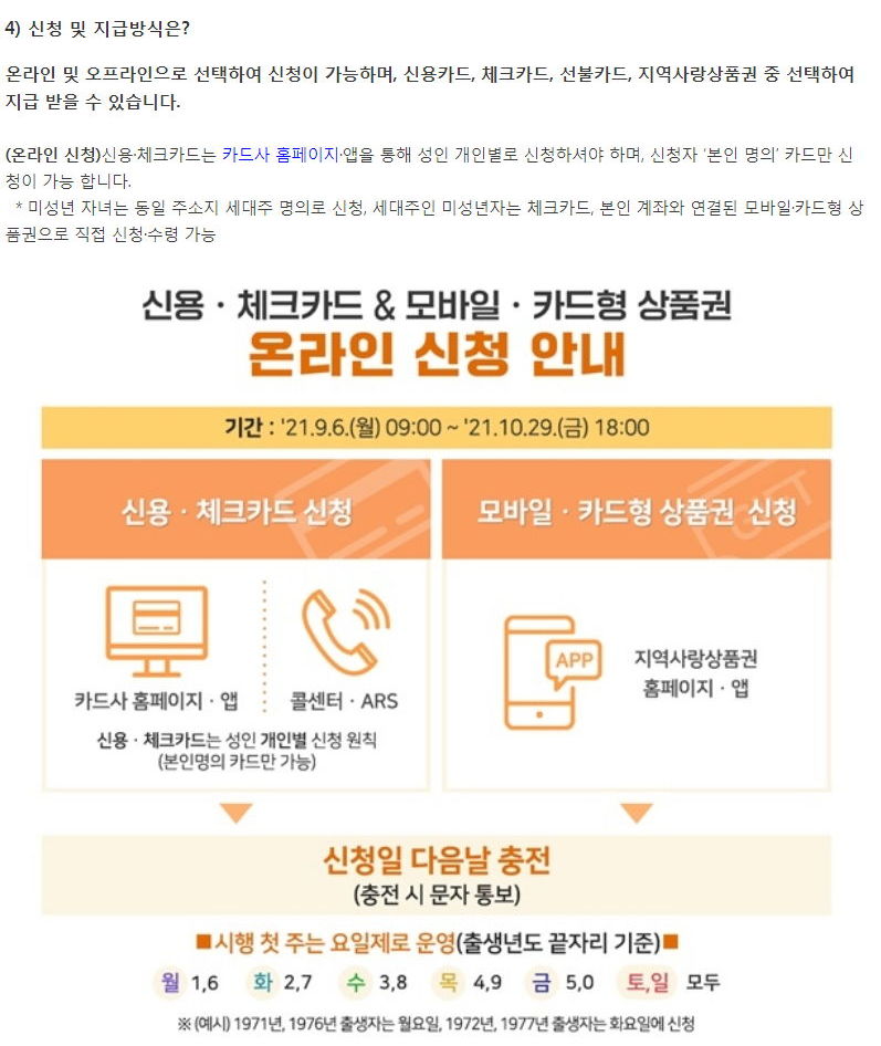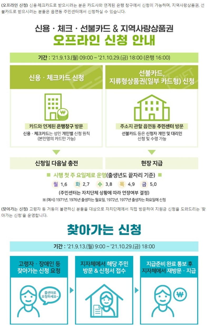 온라인 신청이 가장 쉽고 편합니다. 스마트폰에 신용카드사나 지역화폐 앱을 깔았다면, 거기서도 바로 신청가능합니다 만약 A카드사앱이나 B지역화폐앱에서 이미 신청했다면, C카드사앱에서는 "대상자가 아니다"라고 하거나 "이미 다른 데서 신청했습니다"는 식으로 메시지를 보이며 더 진행하지 않습니다.