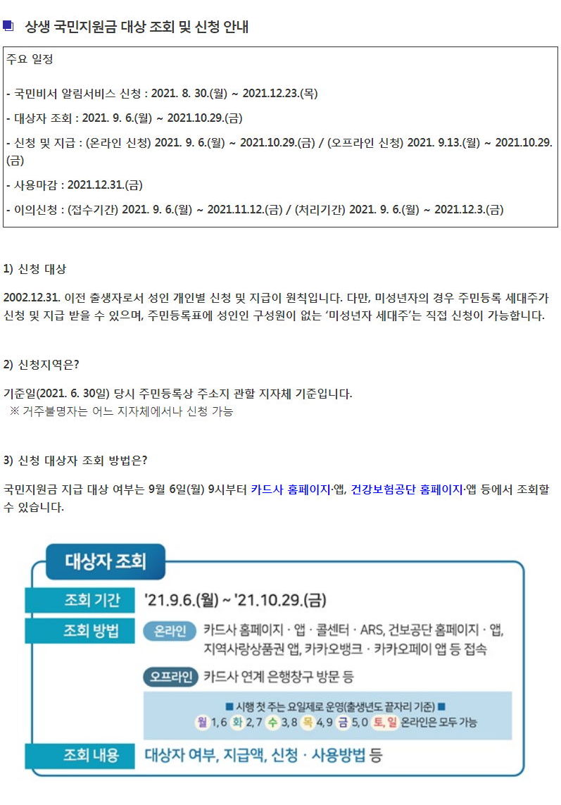"한 큐에 해준다"는 이유로, 조회결과가 대상자로 나오면 자기 서비스에서 신청까지 부지불식중에 하도록 메뉴를 구성해놓은 데도 있습니다. 그래서, 카드가 2개 이상이거나 지역화폐앱도 가지고 있어서 어느 한 곳에서는 대상 확인만 하려 할 때는 주의.