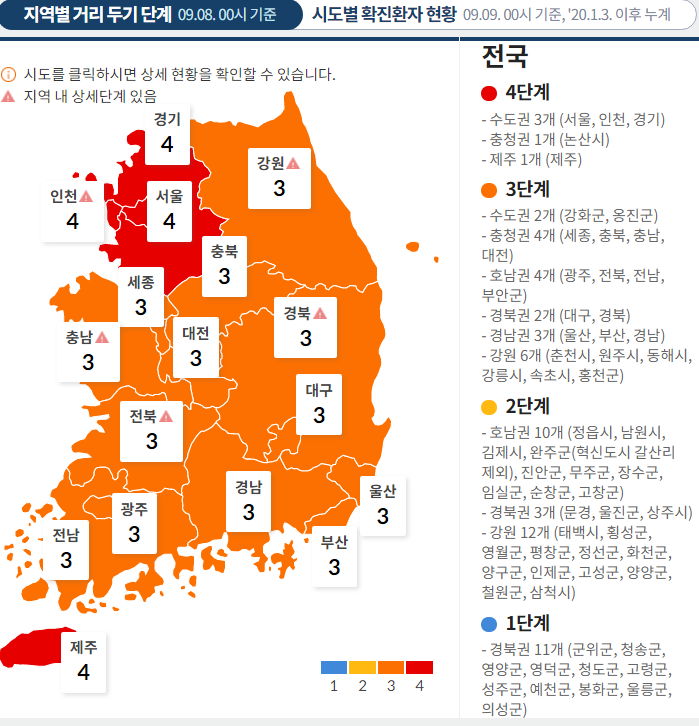 수도권 4단계, 비수도권 3단계 거리두기 4주간 연장(9.6.~10.3.)