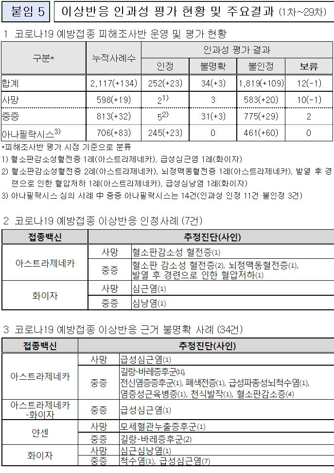 예방접종피해조사반(반장 김중곤 교수), 코로나19 예방접종 후 발생한 이상반응 신고사례에 대한 인과성 평가. 29차(2021.9.3).