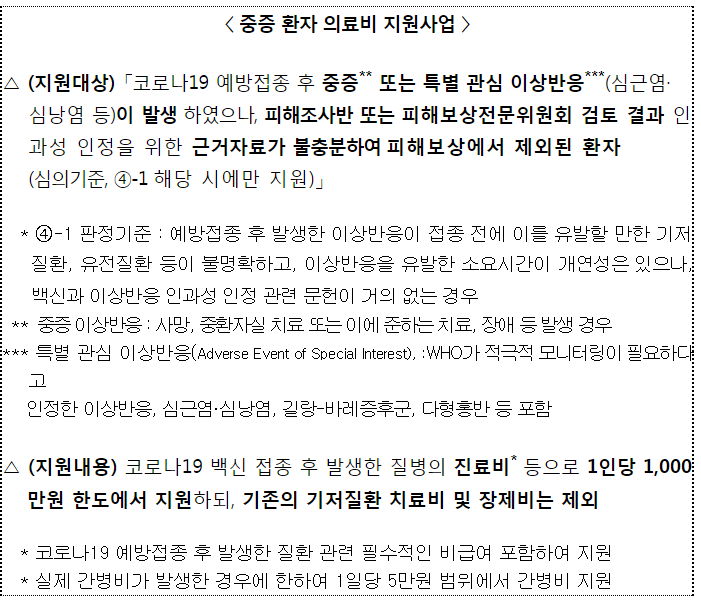 - 코로나19 예방접종 후 인과성 근거가 불충분하여 보상에서 제외된 중증 환자 의료비 지원사업의 지원 대상을 기존 중증 환자에서 경증 포함 특별이상반응*까지 확대