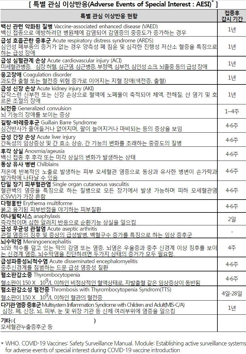 * 특별이상반응 (Adverse Event of Special Interest) : WHO가 적극적 모니터링이 필요하다고 인정한 이상반응, 심근염·심낭염, 길랑-바레증후군, 다형홍반 등 포함 - 9월 9일부터 즉시 시행, 사업 시행일 이전 접종자에 대해서도 소급하여 적용할 예정