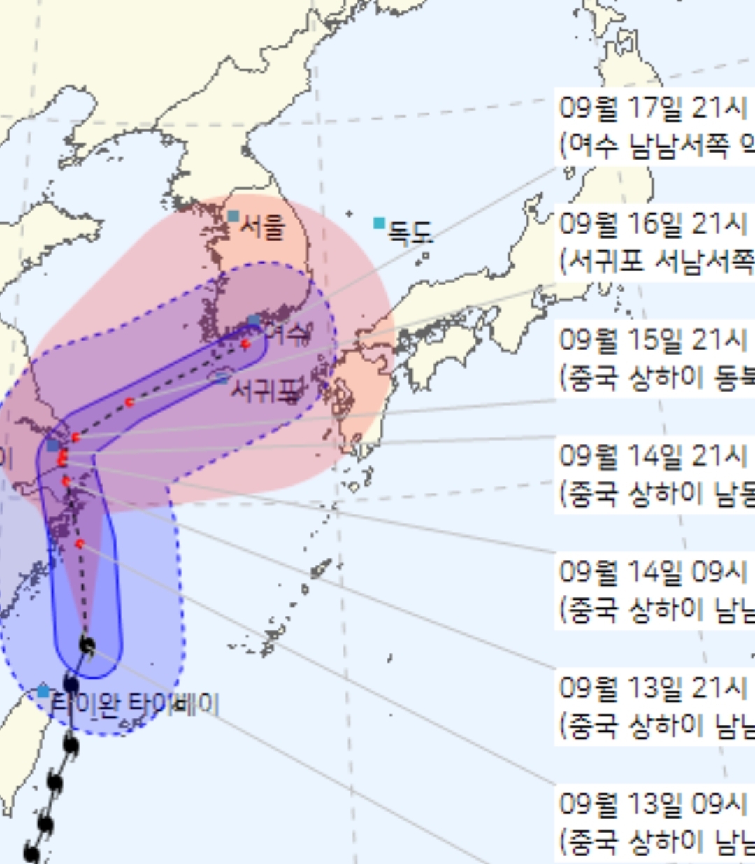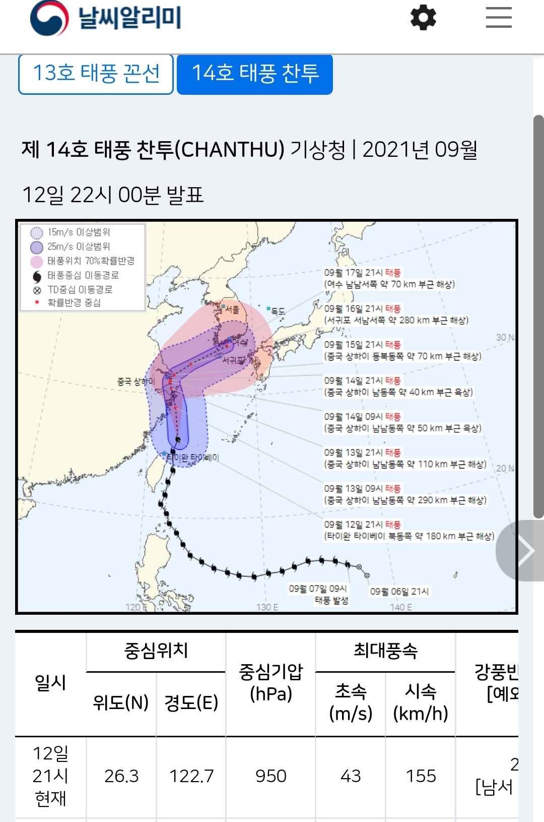 14호 태풍 찬투. 2021. 9. 16~17일 우리나라 남해안 통과 예정 본문