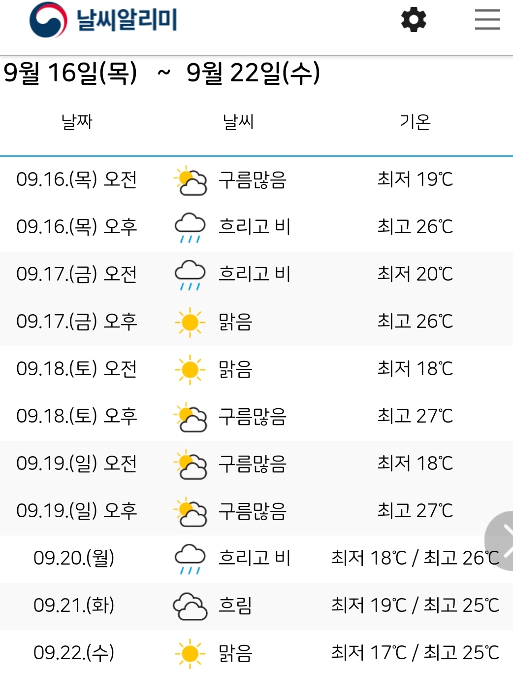 추석연휴까지의 서울 중기 일기예보입니다