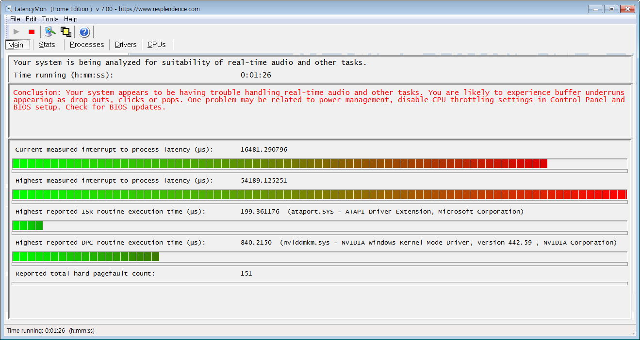 그리고 제일 먼저, 레이턴시몬에서 Drivers 탭을 눌러 확인한 결과, 전체 실행시간과