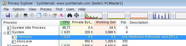 그런데, 이런 건 CPU를 잡아먹더라도 작업관리나 Anvir같은 프로그램에 보이도록 점유율을 먹지, 프로세스 익스플로러에 interrupts로 걸리게 먹지는 않을 것 같은데.. 가상 디바이스라도 깐 걸까요? 일단은 증거가 전혀 없으니 이쪽은 생각하지 않도록 하겠습니다. 하지만 찜찜하니 언제 exe형 보안플러그인은 싹 지워봐야겠습니다..만,