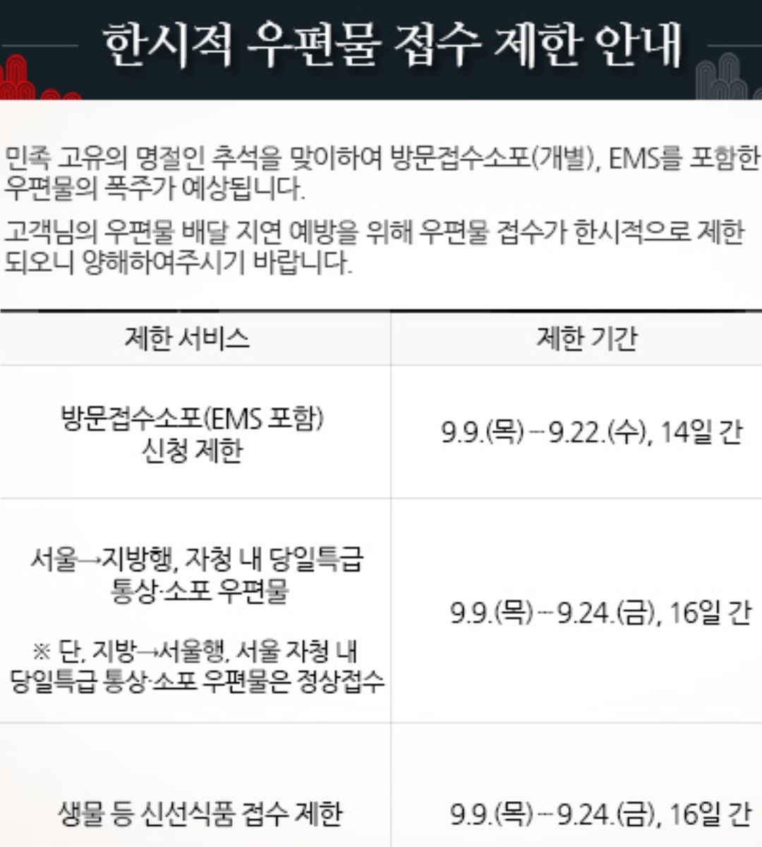 수거중단기간 접수여부는 점포마다 다르겠지만 아마 거절할 것. 분실/파손/변질 우려에 매장내 보관공간이 없기 때문. 그리고 수거해가지 않으면 받는 쪽에서 조회(트래킹)도 안 됨.