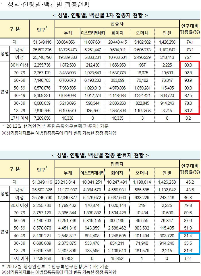 파랑색 사각형은 이제 1차접종시작한 집단. 막 몰아친 효과가 있어서 1차접종완료비율은 다른 연령대와 별 차이가 안 납니다. 2차접종비율도 상당한 이유는 아마, 연초부터 업종별 종사자 접종을 연령대와는 따로 했는데, 그때 맞은 사람들이 있을 테고, SNS를 잘 쓰는 경제활동인구가 집중돼있는 만큼 잔여백신을 맞은 사람도 이 연령대일 것입니다.