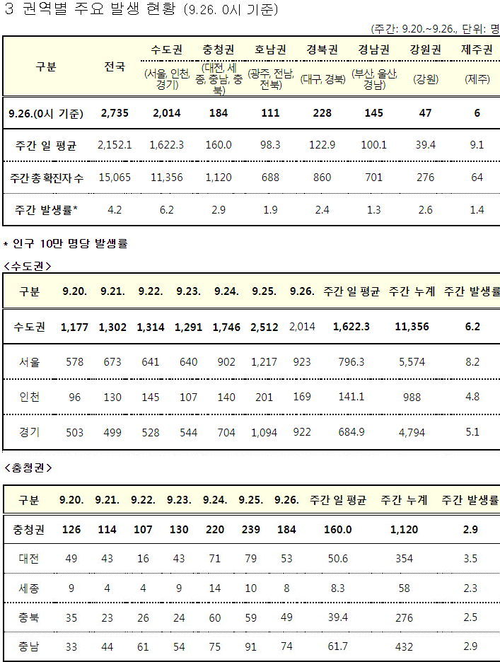 수도권(서울 경기 인천)은 2033명 (지역인구 2592.6만 명/ 면적 1.18만km^2 )