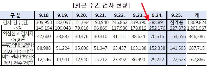 우리나라 일일 검사실적은 최대 40만 건 정도입니다.