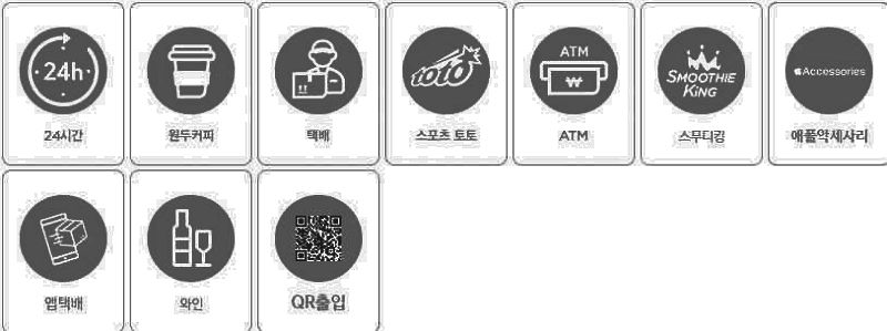 '지도보기'를 클릭하면 지도로 보여줍니다. 각 아이콘은 매장의 영업시간(24시간 영업여부)과 어떤 상품이나 서비스를 제공하는지 등. ATM, 택배, 앱택배, QR출입, 애플악세사리 등.