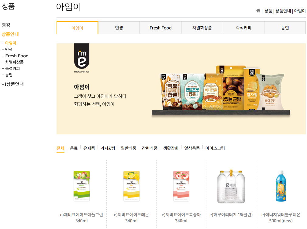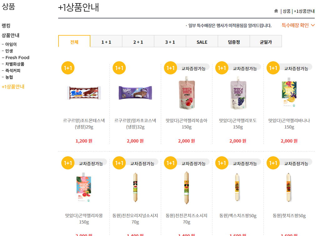 상품안내쪽을 보면, 1+1 행사하는 상품목록도 보입니다. 상품안내는 2종류인데,