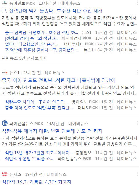 전세계가 석탄값 급등.. 아 젠장. 자원외교 빚잔치하라며 공기업을 압박해서 몇 년 전 석탄광산매각한 게 있었을 텐데. 타이밍 참 못마주네요.. 마이너스의 손은 꼭 바닥에서.;;