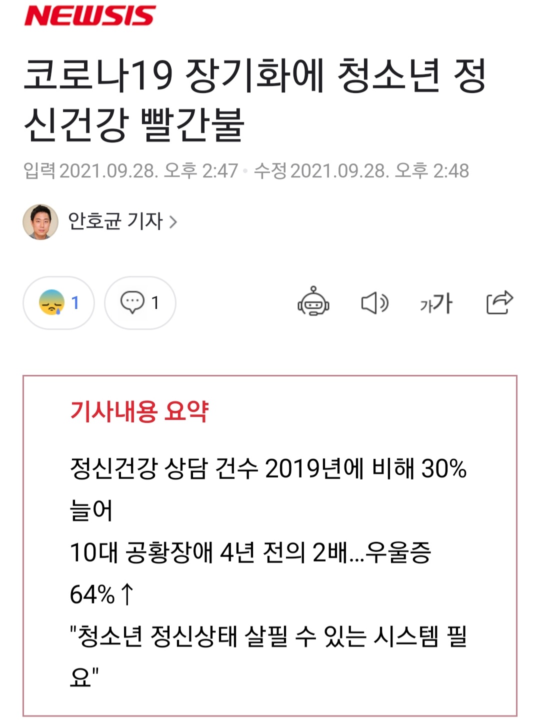 원격수업, 영상강의로 학교생활하는 시간이 줄어든 만큼 청소년 정신건강을 신경써야 하지 않냐는 기사를 읽고 본문