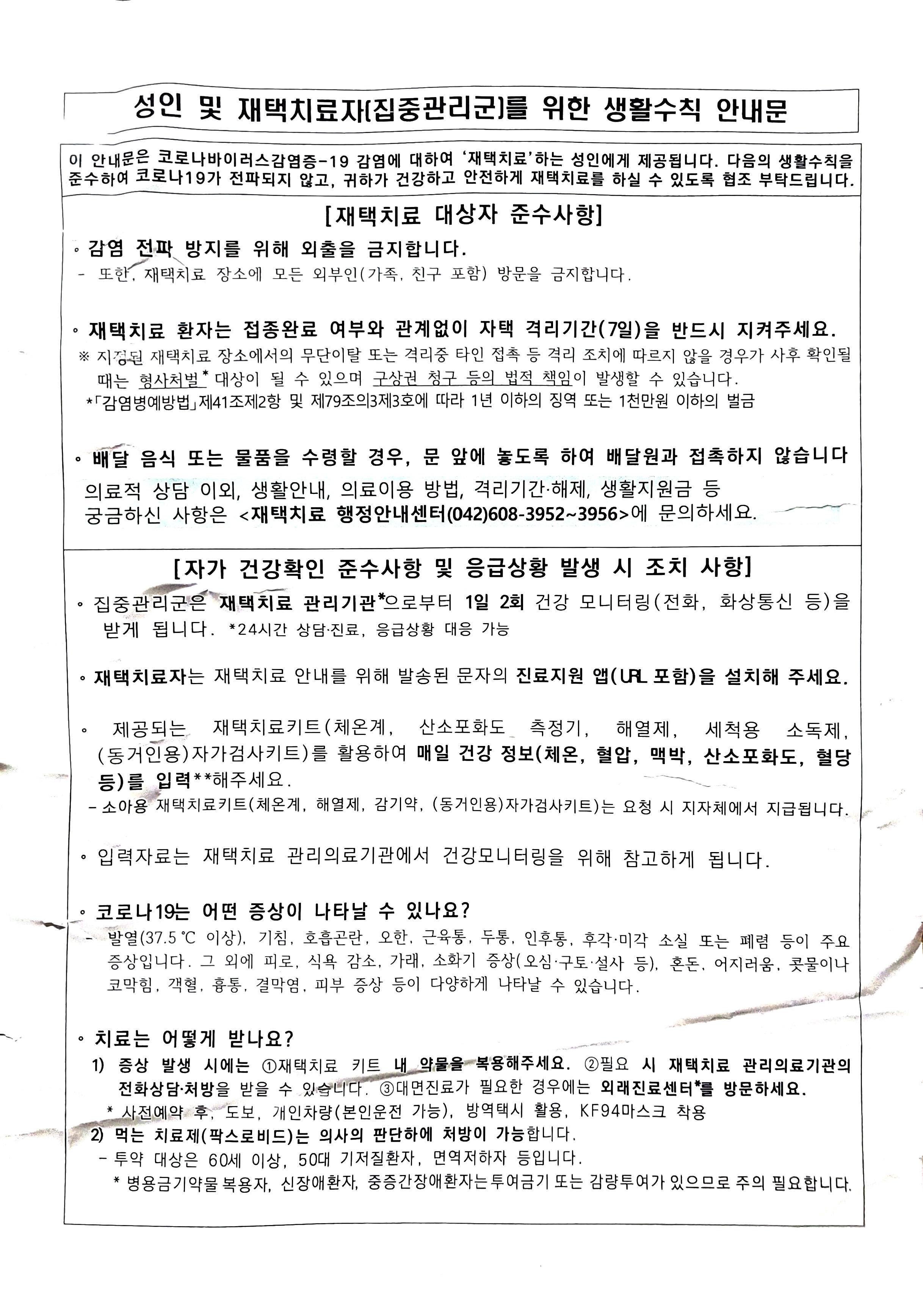 유행때 재택치료/자가격리 안내문.