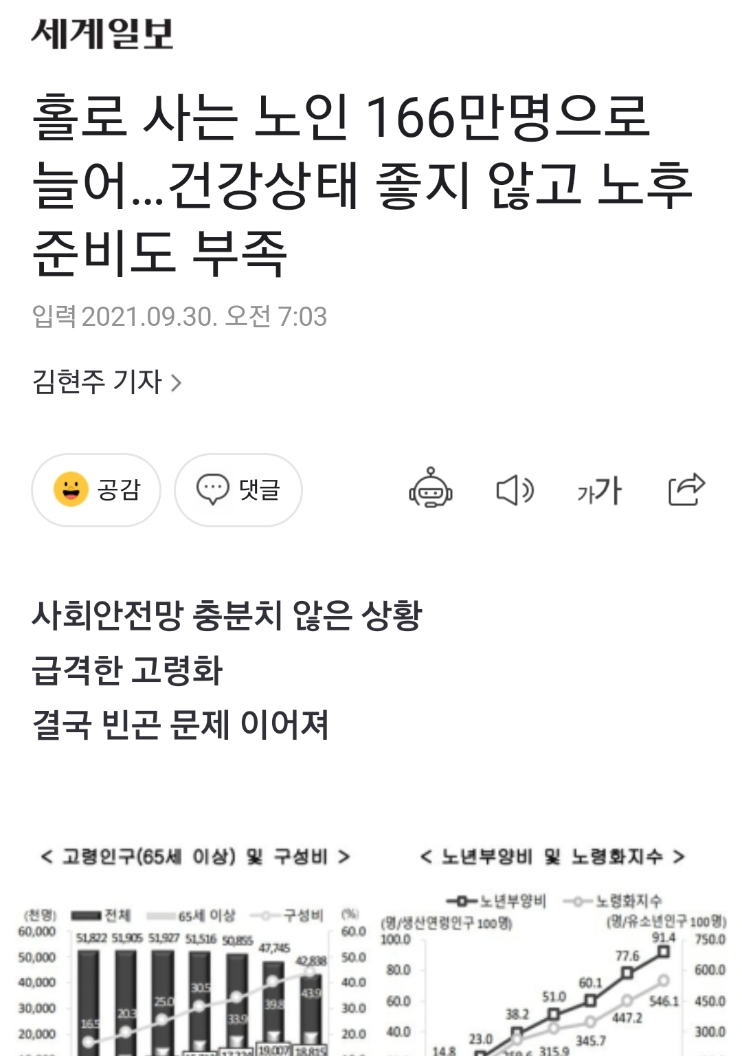사회안전망 충분치 않은 상황 급격한 고령화 결국 빈곤 문제 이어져 홀로 사는 노인이 지난해 166만명으로 늘었다. 이들은 건강상태가 좋지 않고 노후 준비도 부족한 경우가 많아 위험가구로 분
