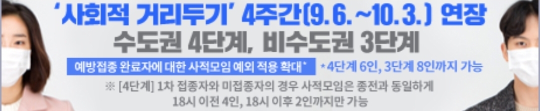 | 코로나19 집계(2021.10.1. 0시 기준): 2486명/:/ 향후 2주간, 현행 사회적 거리두기 단계 그대로 유지 (0) | 2021.10.01 |