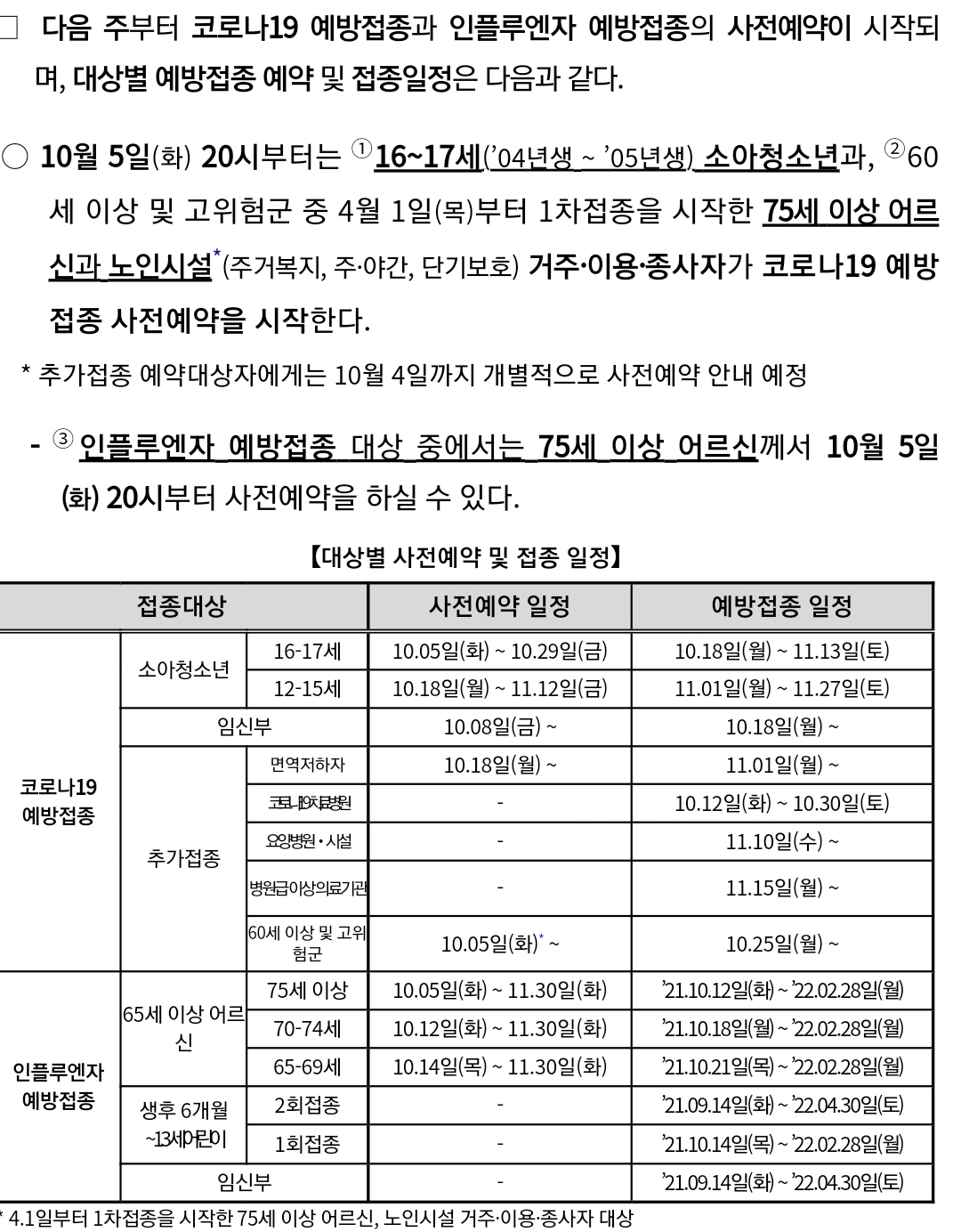 독감(인플루엔자)예방주사 일정 등.