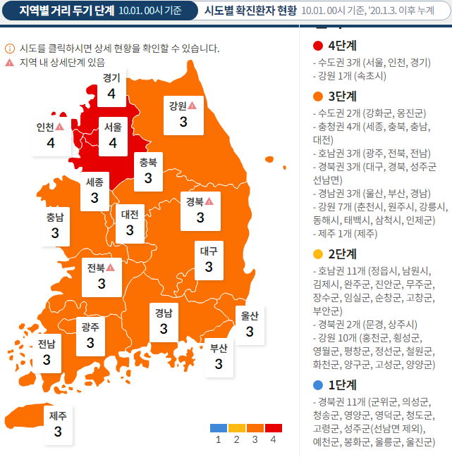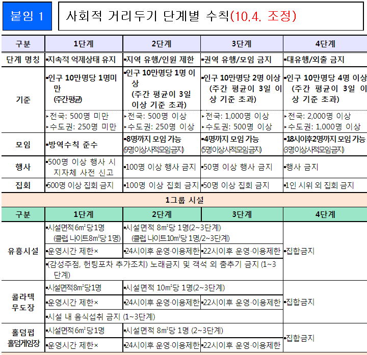 "현재 적용 중인 사회적 거리두기 단계(수도권 4단계, 비수도권 3단계)를 10월 4일(월) 0시부터 10월 17일(일) 24시까지 2주간 연장한다. (비수도권 인구 10만 이하 시‧군은 자율적 단계 조정 유지)"