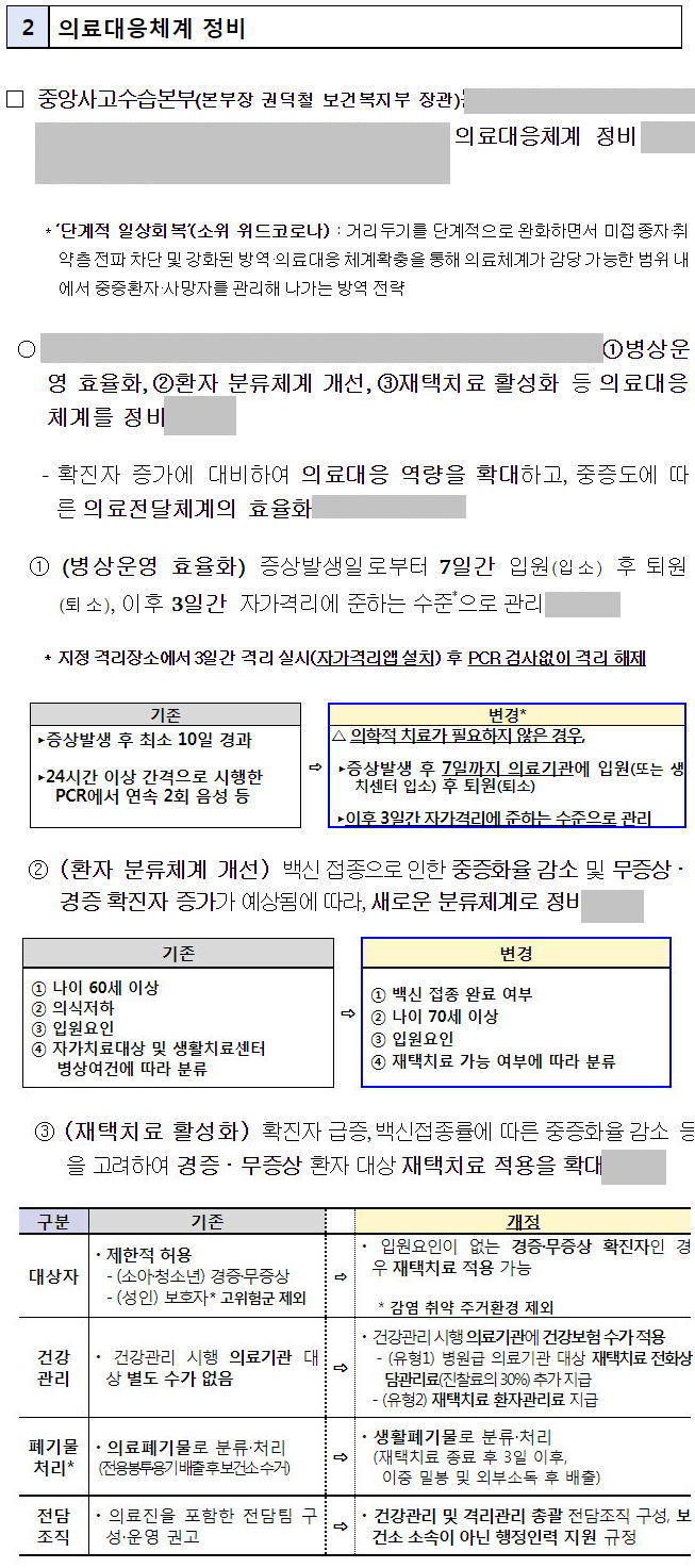입원환자 및 무증상환자 재분류, 재택치료, 병상운영 효율화 방안