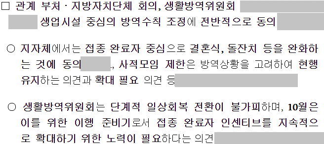 ※ 생활방역위원회는 2020년 4월에 첫 회의가 있었는데, '고양이목에 방울달기'를 위해 익명으로 책임전가하는 거수기나 요식행위같다는 느낌이 강합니다. "사회적 거리두기"란 이름짓기와 마찬가지로, "의사결정에 당신도 참여하고 있다"는 착각을 주는 것. 한두 번 위원 명단이 공개된 적 있지만, 물의를 일으킨 적이 있어서인지 그 다음에는 복지부장관과 당연직이라 할 몇 군데를 빼고는 소개하는 웹페이지가 따로 보이진 않네요(한편 가끔 매체에 언급되는 어떤 백신자문 전문가집단의 경우에는 복지부 웹사이트에 명단이 있습니다). "권덕철 보건복지부 장관과 이윤성 한국보건의료인국가시험원장이 공동 위원장을 맡고 의약계 등 관계 전문가 8인, 인문사회 학계 5인, 시민사회 대표 2인, 소상공인 대표 2인, 정부 2인 등이 참여"(2021.8.18 뉴시스 기사) "백신접종을 서두를 필요없다"던 무지한 소리와, "4차 유행은 우리 하기 달렸지 난 모른다"는 사주팔자 발언으로 유명했던 기모X씨도 여기 위원일을 하다가 8월에 가서야 빠졌습니다.