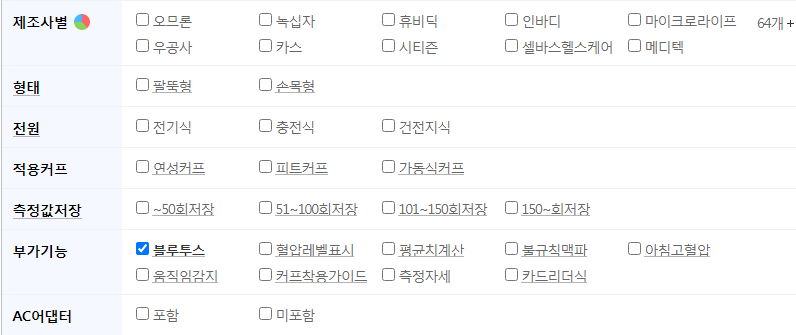 가격비교사이트 다나와의 혈압계 검색옵션.
