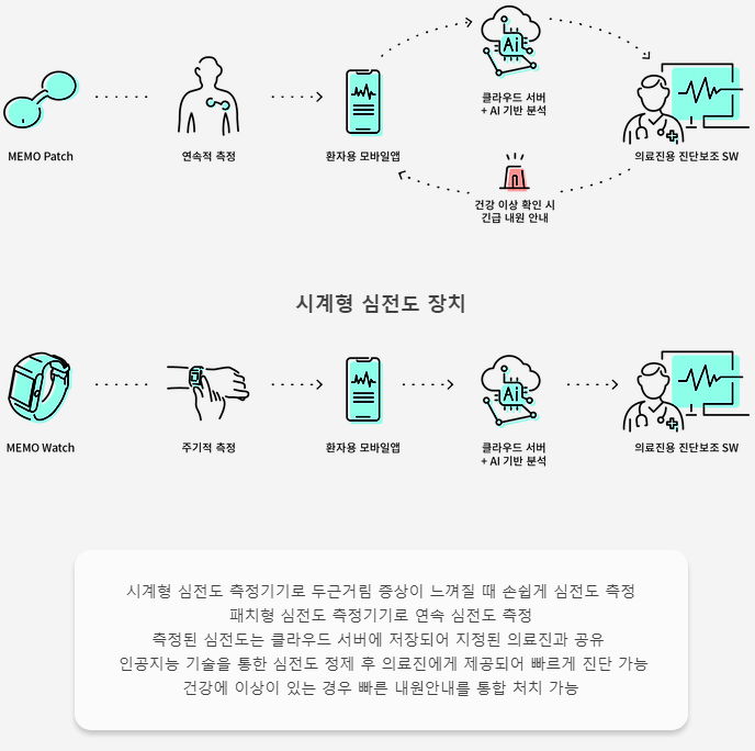 아래는, 이 분야 웨어러블로 원격의료규제 샌드박스에 선정됐는데, 첫타자라 우여곡절이 많았던, 휴이노의 메모워치/메모패치 이야기. 이건 갤럭시워치와 달리 진짜 의료기기고 병원에서 대여하는 방식으로 사용하는 기계.