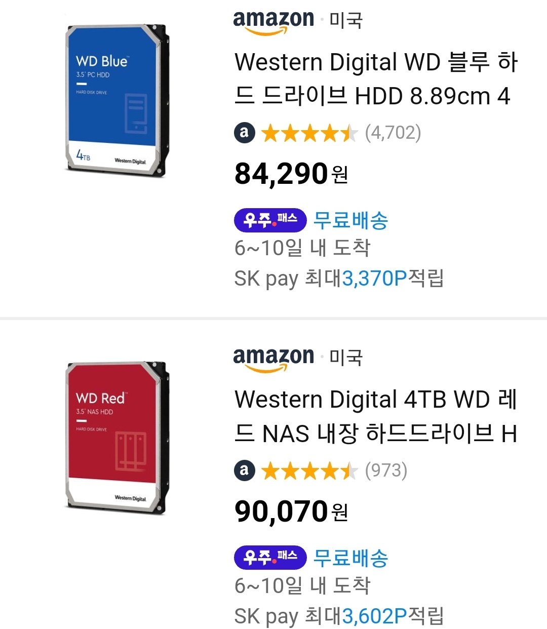 (11번가-아마존) WD 4TB 3.5" HDD, 블루 8.4만원, 레드 9만원 본문