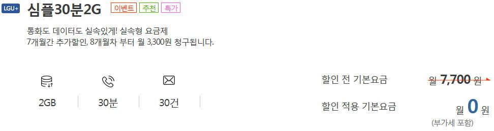7개월한정 0원, 8개월차부터 월 3300원. 해지월 할인 미적용 일할계산.