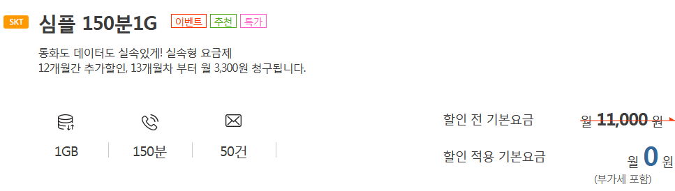 12개월 한정 0원. 13개월차부터 월 3300원. 해지월 할인 미적용 일할계산