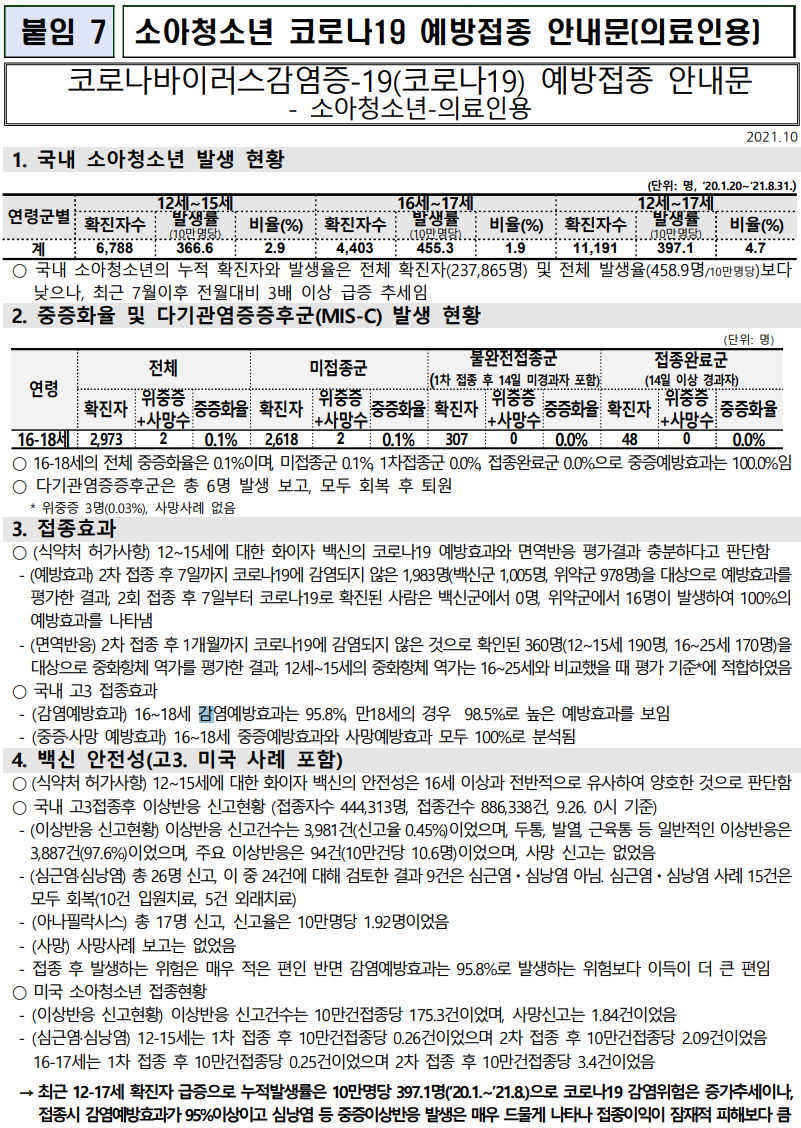 | 제10차 코로나19 예방접종피해보상 전문위원회 결과/예방접종 피해조사반의 이상반응 사례평가 결과 분석 (~10.1.)/:/ 2021.10.7.정례브리핑 보도자료 (0) | 2021.10.08 |