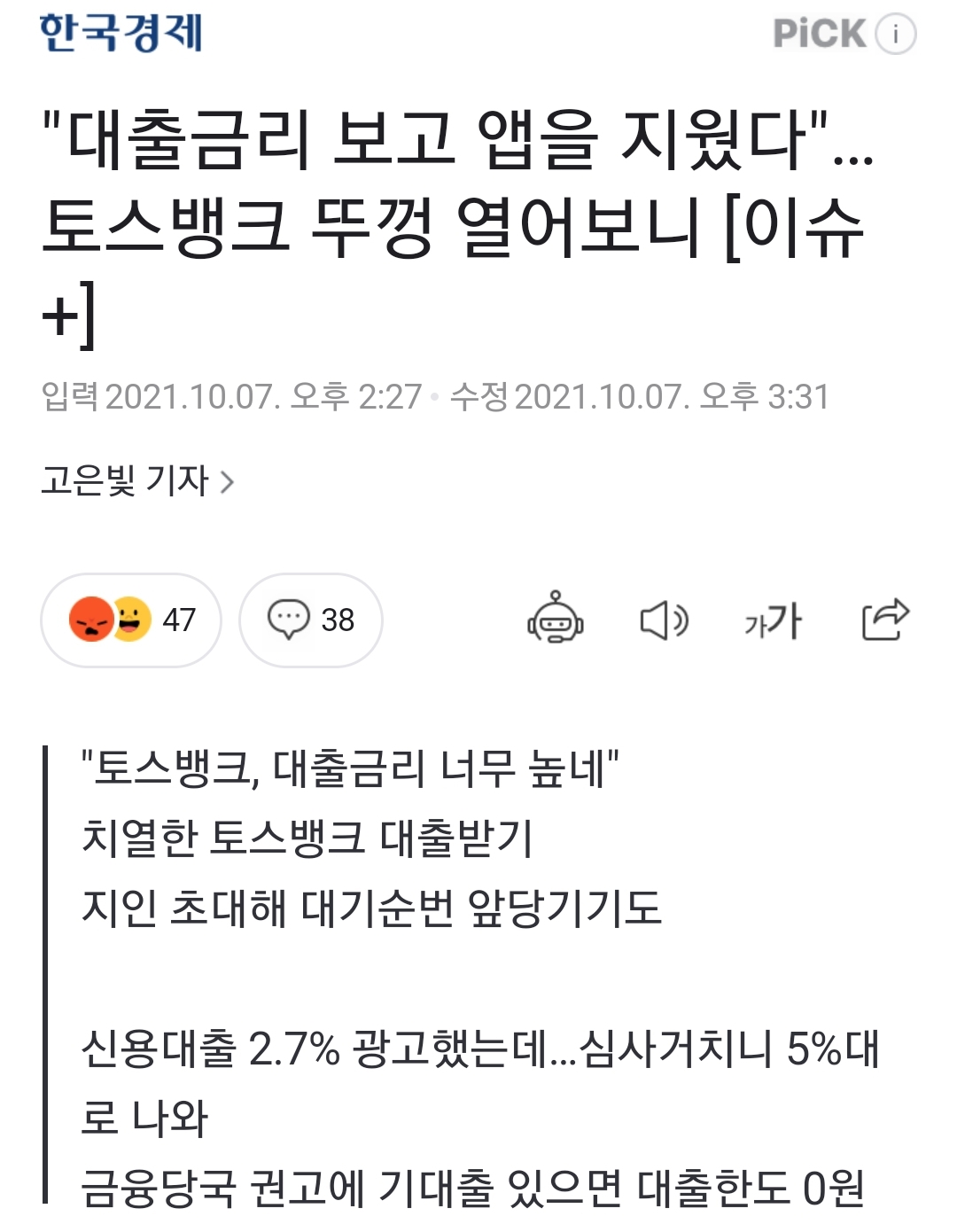 토스뱅크 대출금리가 기대밖으로 높다는 기사 본문