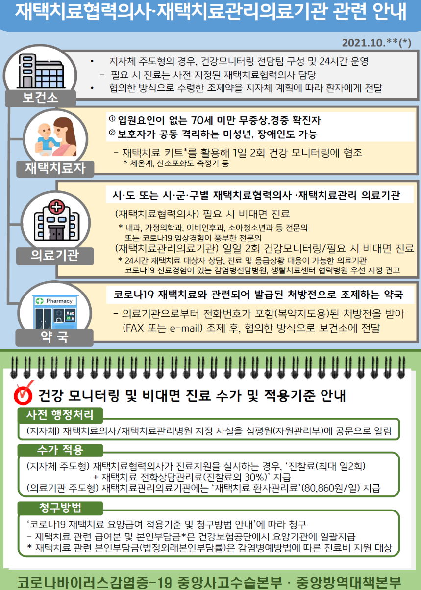 재택치료체계에 참가한 의료기관은 재택치료 관리에 대한 건강보험 수가 지급.
