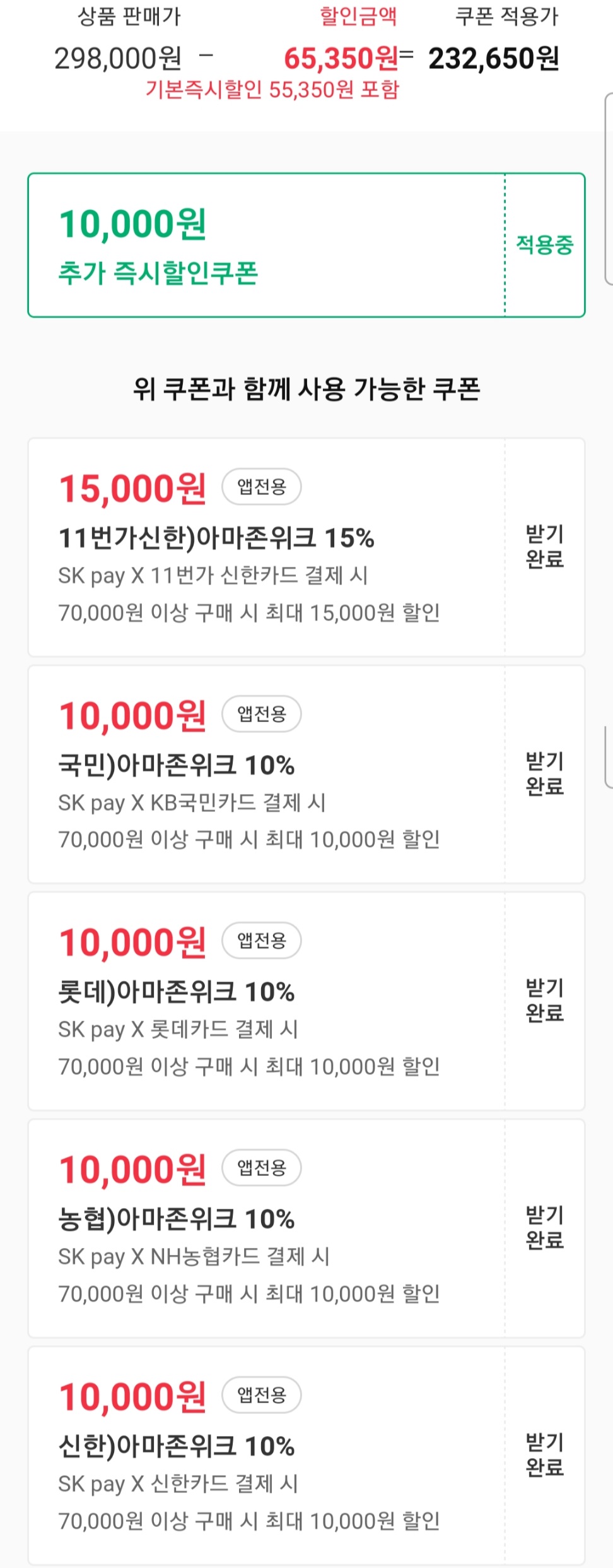 11번가 SK페이로 결제할 때, "11번가 신한카드"결제자는 1.5만원까지, KB/롯데/농협/신한카드 등 다른 카드 결제자는 1만원까지 상품할인쿠폰을 주고 있습니다.