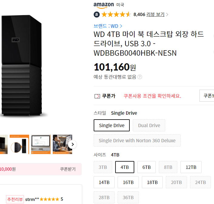 (11번가-아마존) WD 4TB 마이북(3.5") 외장하드(10.1만원+추가할인; 최대 8.1~9.1만원) 본문