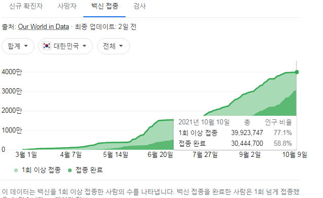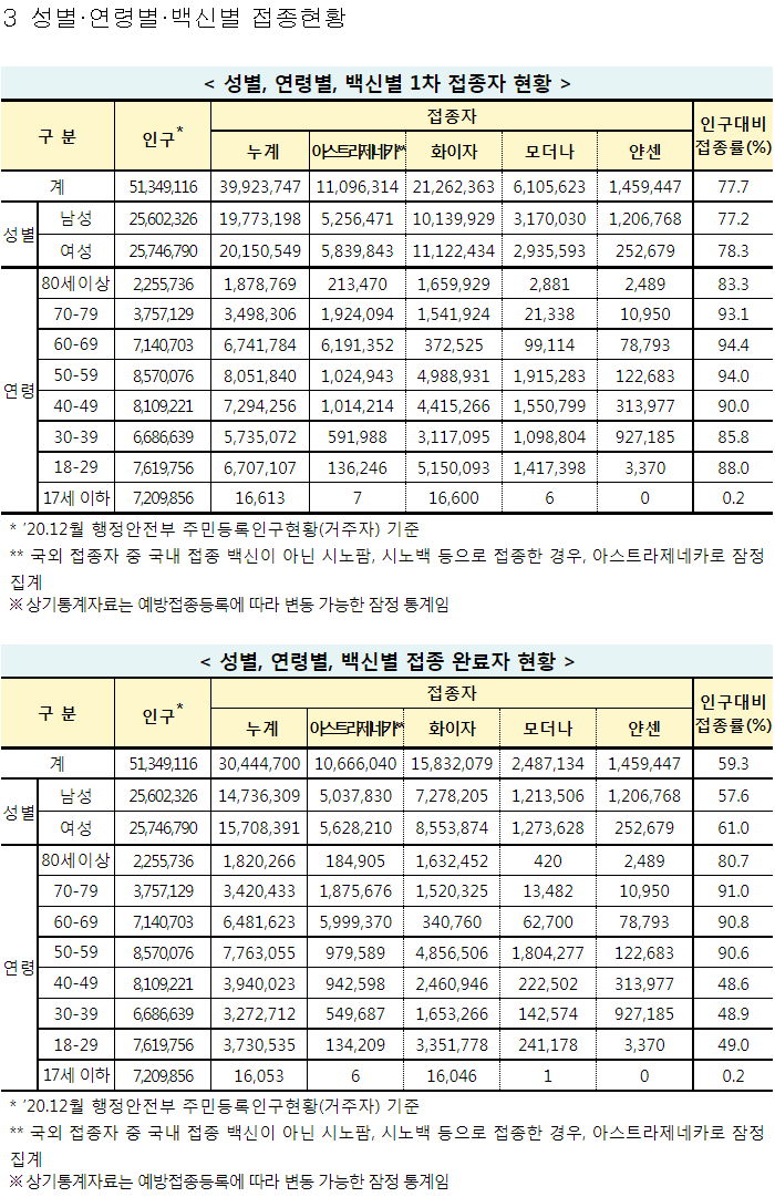 전국민의 77%가 1회 이상 접종. 18세 이상 접종대상인구의 90%.