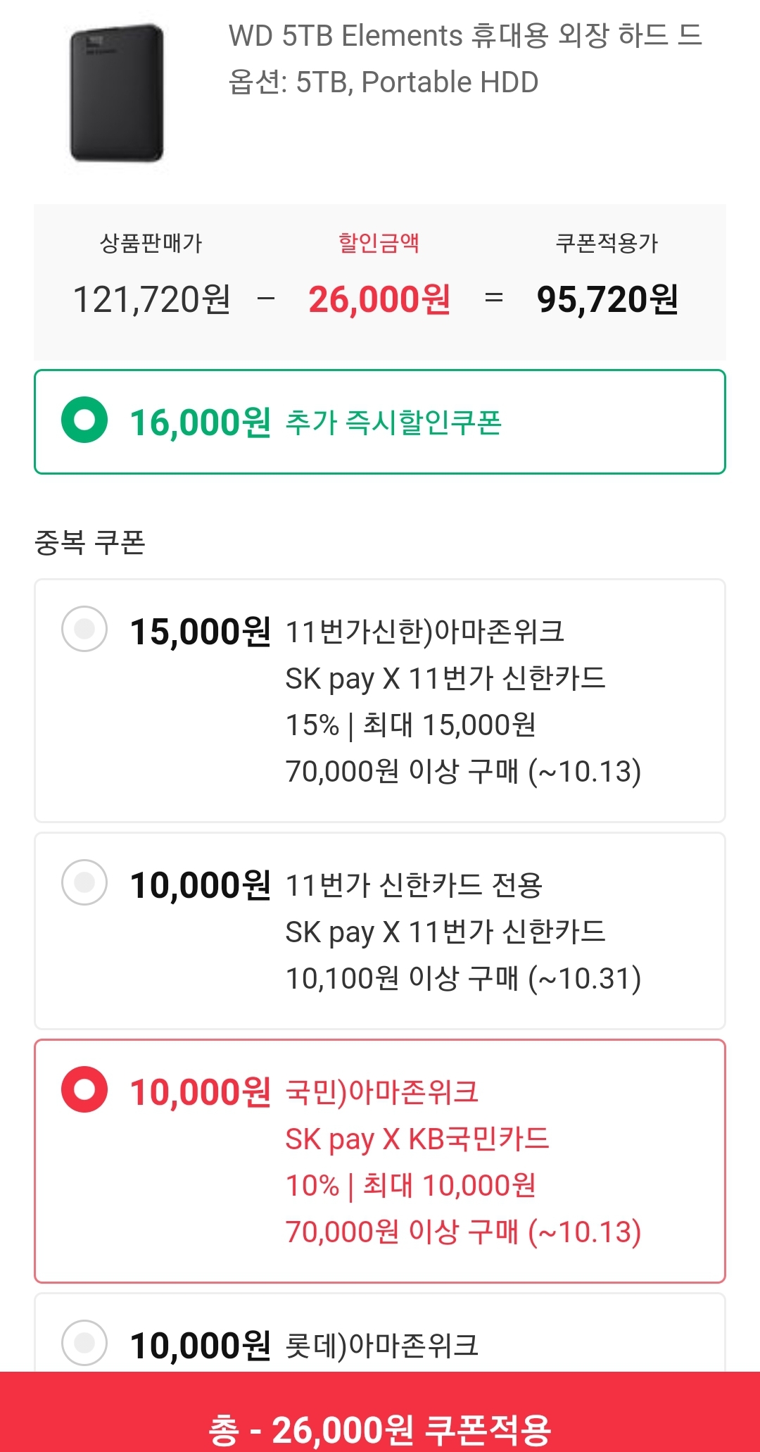 (11번가-아마존) 웨스턴디지털(WD) 5TB 2.5"외장하드(~10.5만원; 최대 8.5~9.5만원) 본문