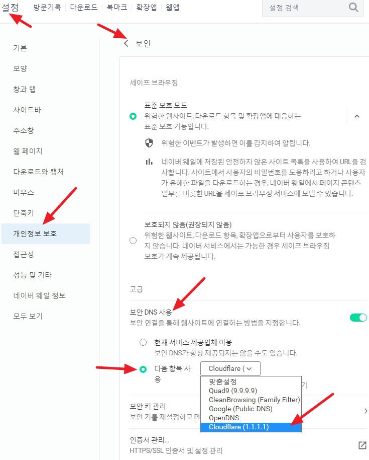 네이버 웨일, 구글 크롬 등 크로뮴계열 웹브라우저에서 DNS설정 본문