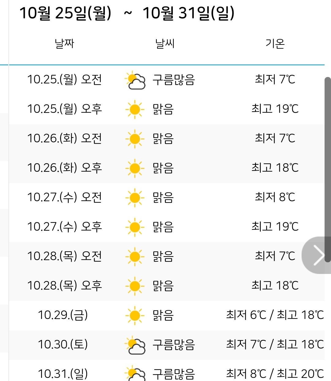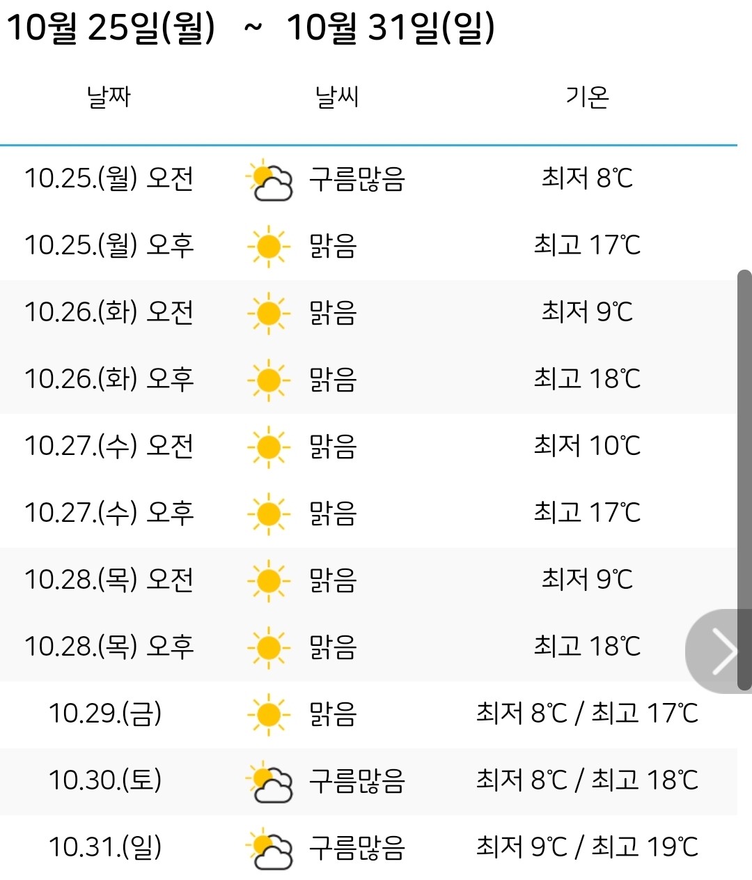 | 10월말까지 날씨: 10도 미만 ~ 20도 미만 (0) | 2021.10.19 |