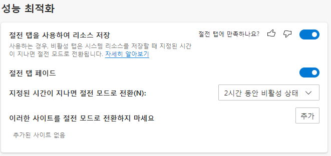 절전기능은 배터리세이버라고 웨일에도 메뉴는 있지만, 예전같이 구체적인 설정메뉴는 설정화면에선 사라진 상태입니다.
