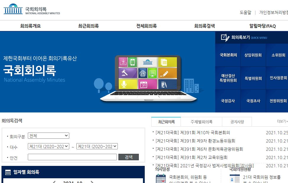 국회 회의록(속기록)을 볼 수 있는 사이트(대한민국국회) 본문