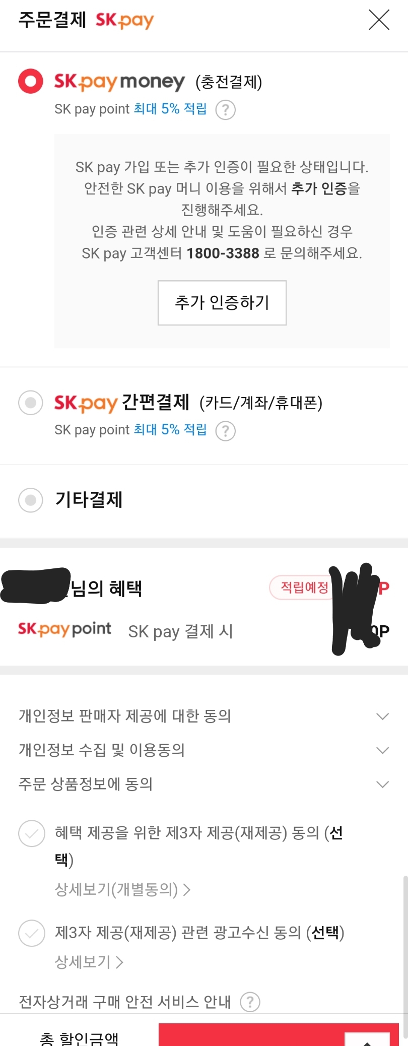 SK가 미는 간편결제인 SK pay(구 시럽페이)에 회원가입하지 않으면, 적립한 포인트(SK pay point)와 SK pay money 를 사용할 수 없게 만들었군요.