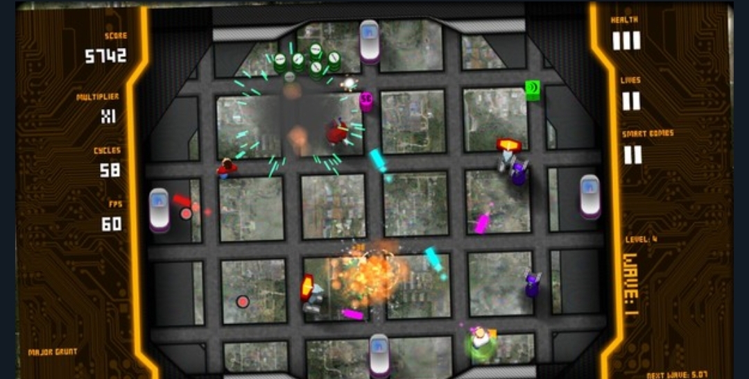 An addictive fast paced twin stick arena shooter with banging electronic sound track, nostalgic nods and a barrage of flashing lights and bullets. Your task is simple, kill drones, free humans, don't die!