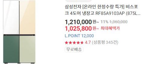 비스포크나 오브제를 욕심내지 않는다면, LG전자, 삼성전자의 8백리터대 양문형이 90만원대에 나와있습니다.