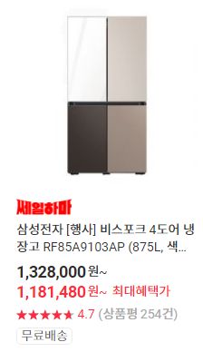 비스포크나 오브제를 욕심내지 않는다면, LG전자, 삼성전자의 8백리터대 양문형이 90만원대에 나와있습니다.