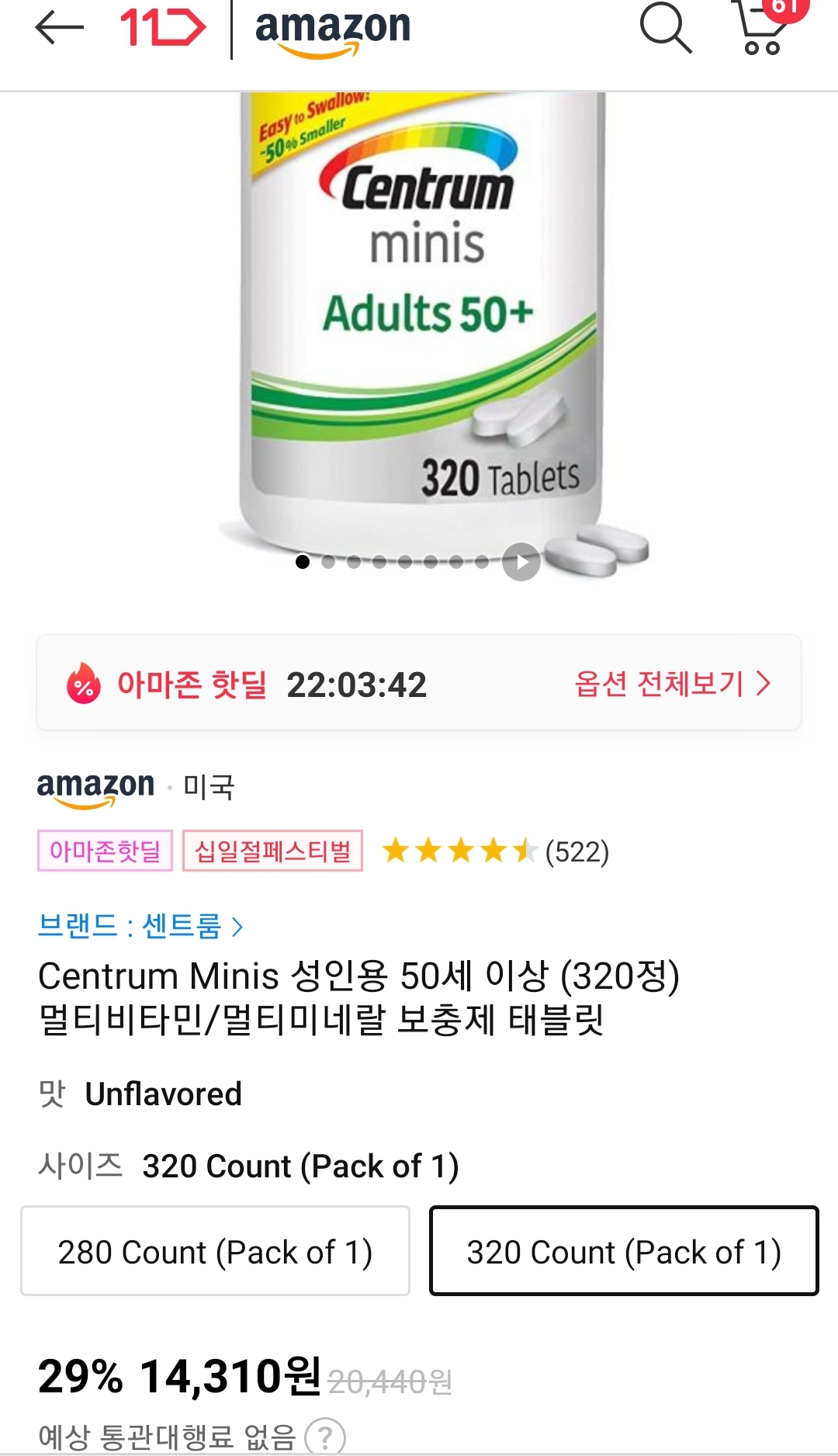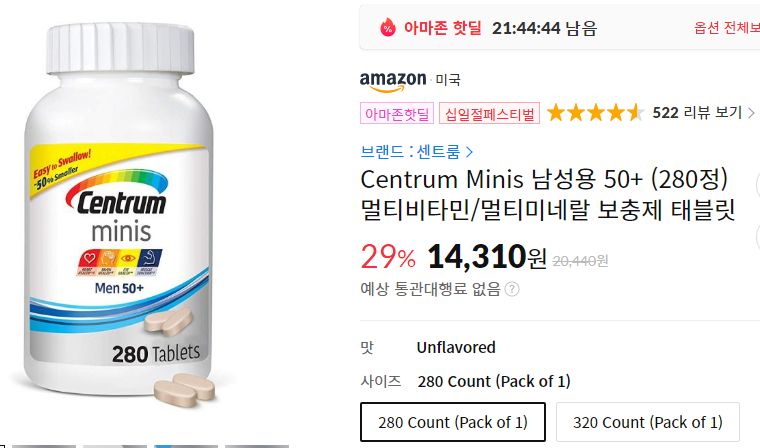 (11번가-아마존) 센트룸 Centrum Minis Adults 50+(50세 이상) 320정, 남성용 50+ 280정 (~1.4만원) 본문