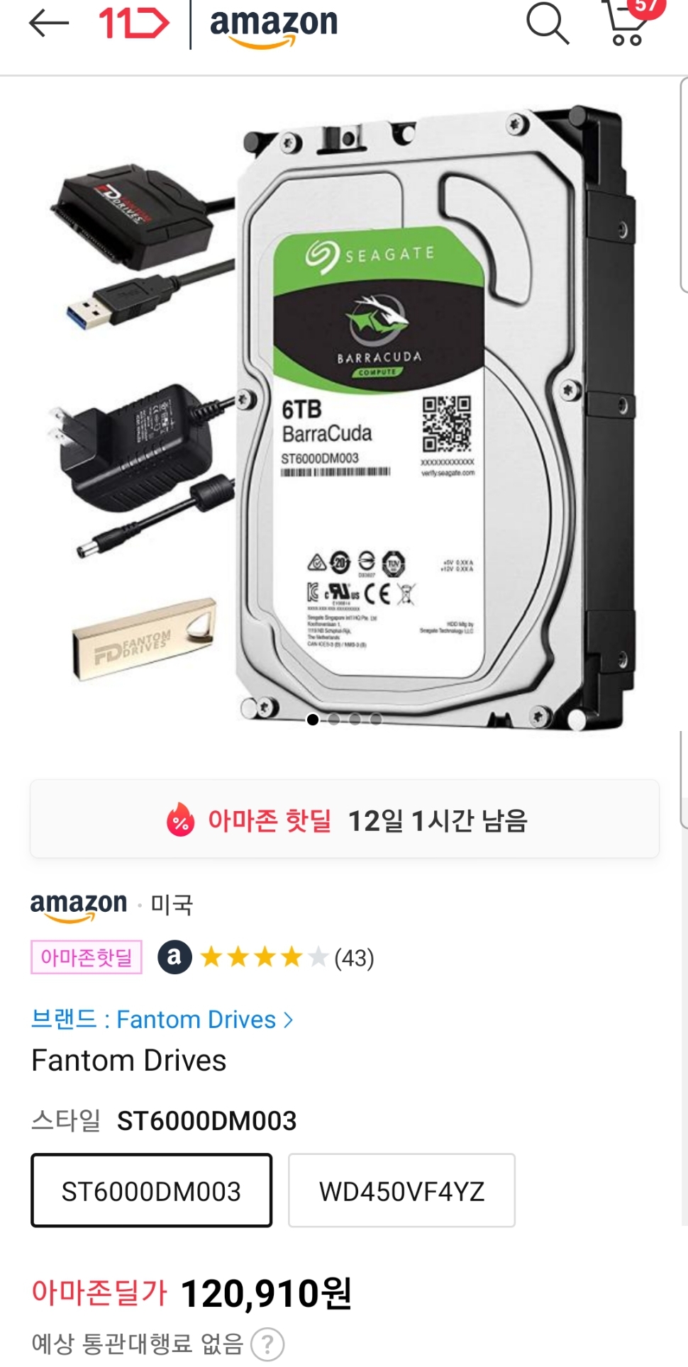 (11번가-아마존) 시게이트 6TB 하드디스크+usb3.0 키트 세트 (12만원) ST6000DM003, 5400RPM, 256MB Cach 본문