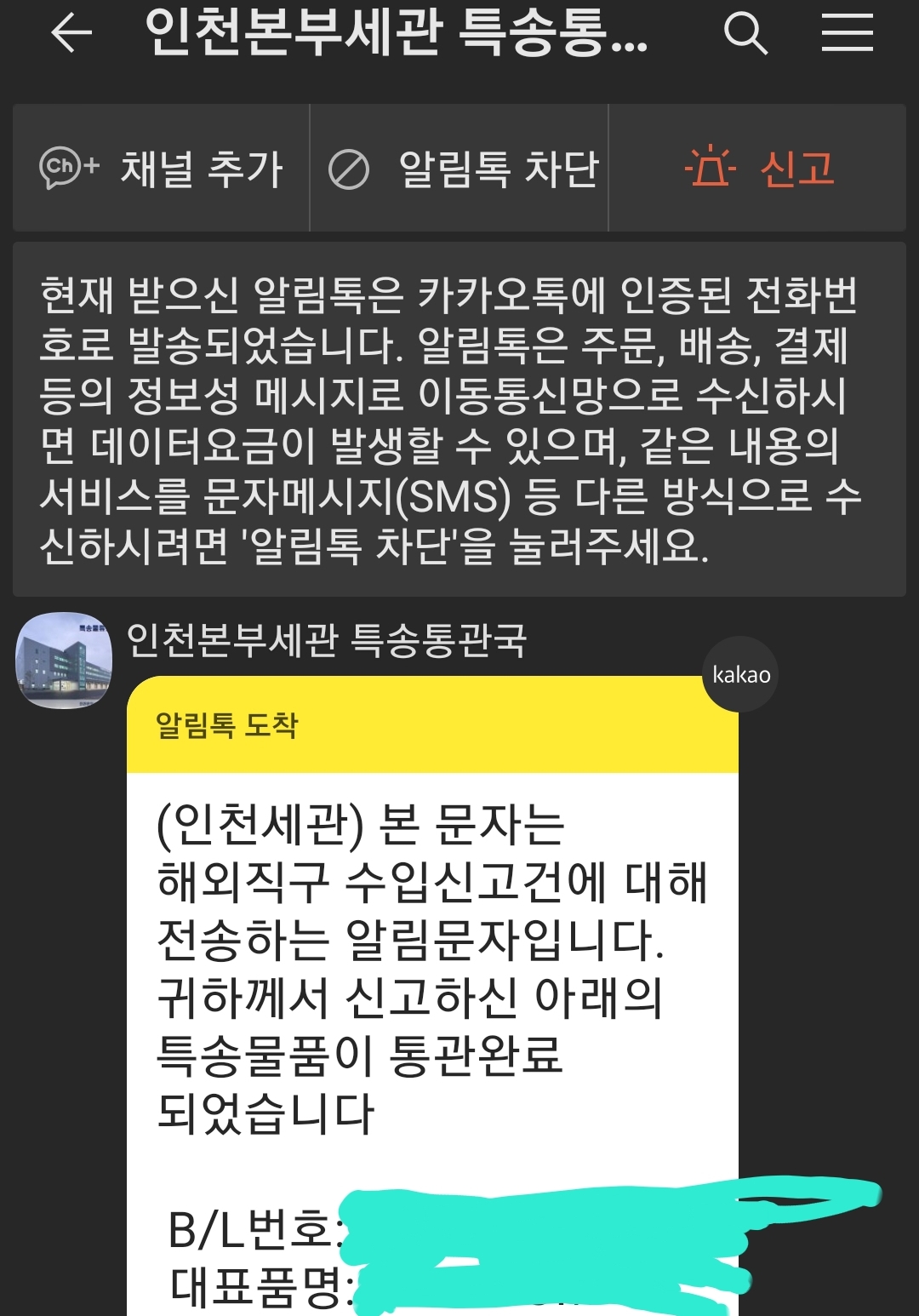 인천세관입니다..라며 뜨는,